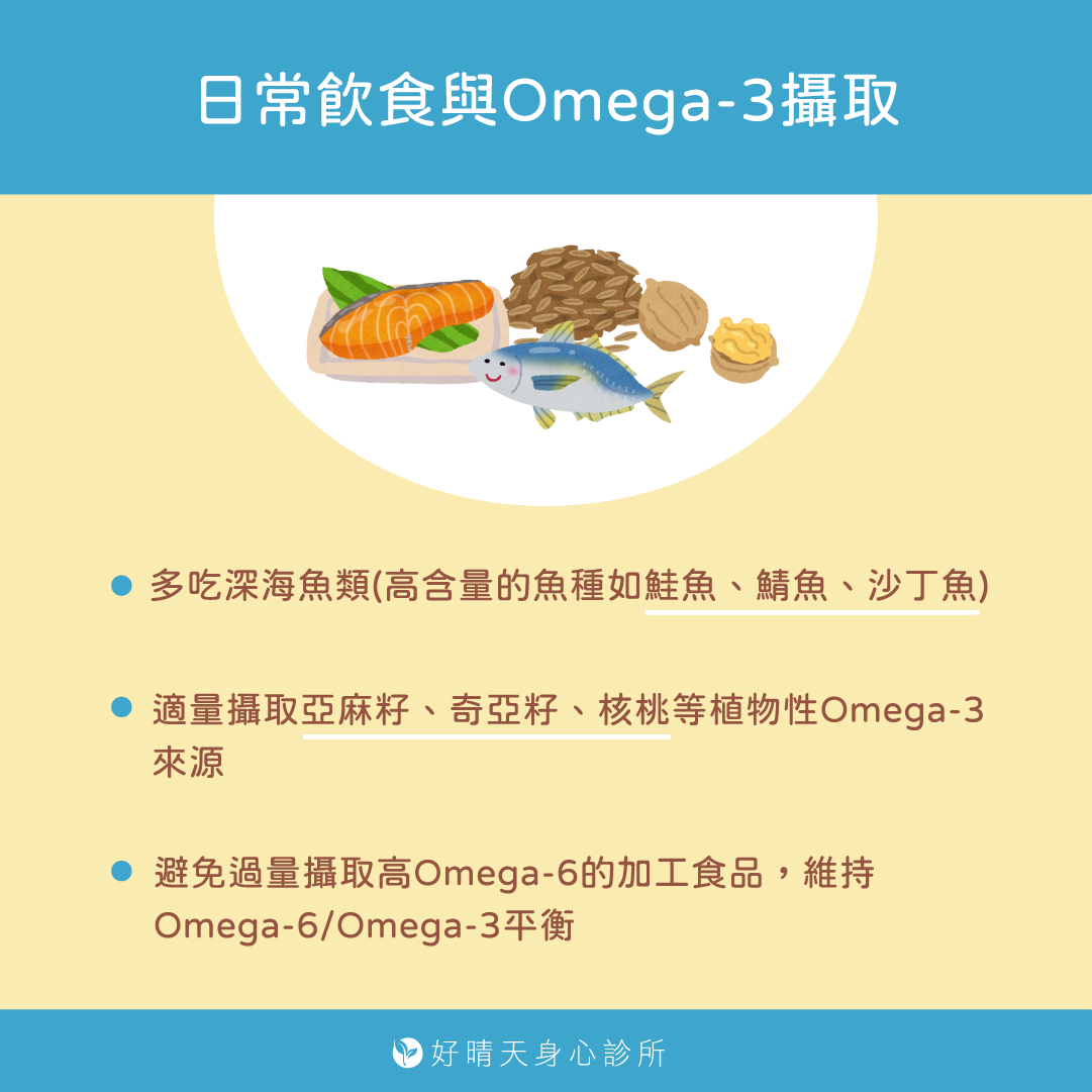• 避免過量攝取高Omega-6的加工食品,維持Omega-6/Omega-3平衡