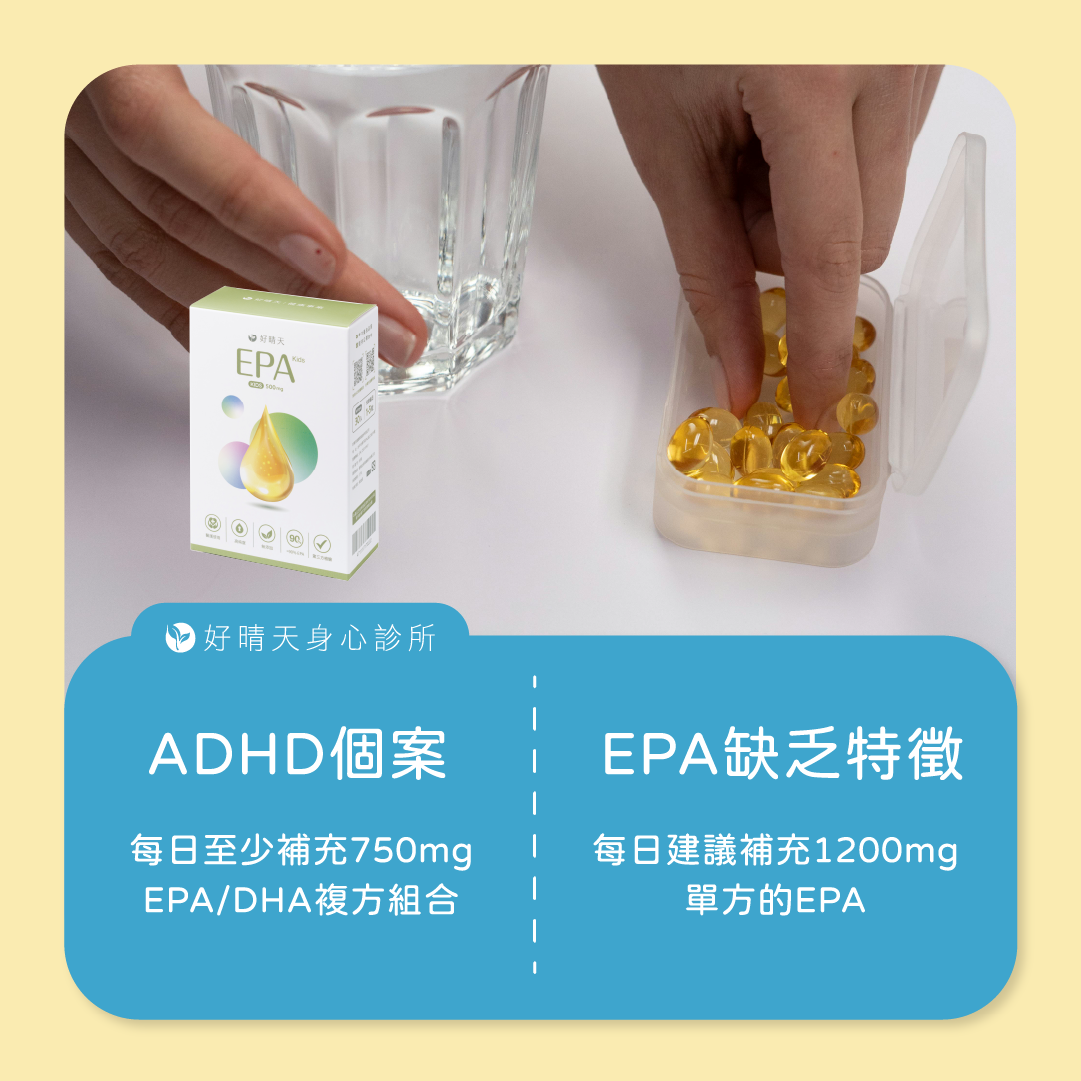 • 根據台灣營養精神醫學會「Omega-3脂肪酸在兒童青少年精神疾病之臨床指引」,建議ADHD個案每日至少補充750mg EPA / DHA複方組合,若呈現EPA缺乏的特徵,每日建議補充1200mg單方的EPA。